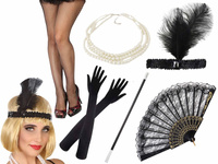 ZESTAW RETRO DAMSKI LATA 20 30 PRZEBRANIE KARNAWAŁ PERŁY WACHLARZ RAJSTOPY