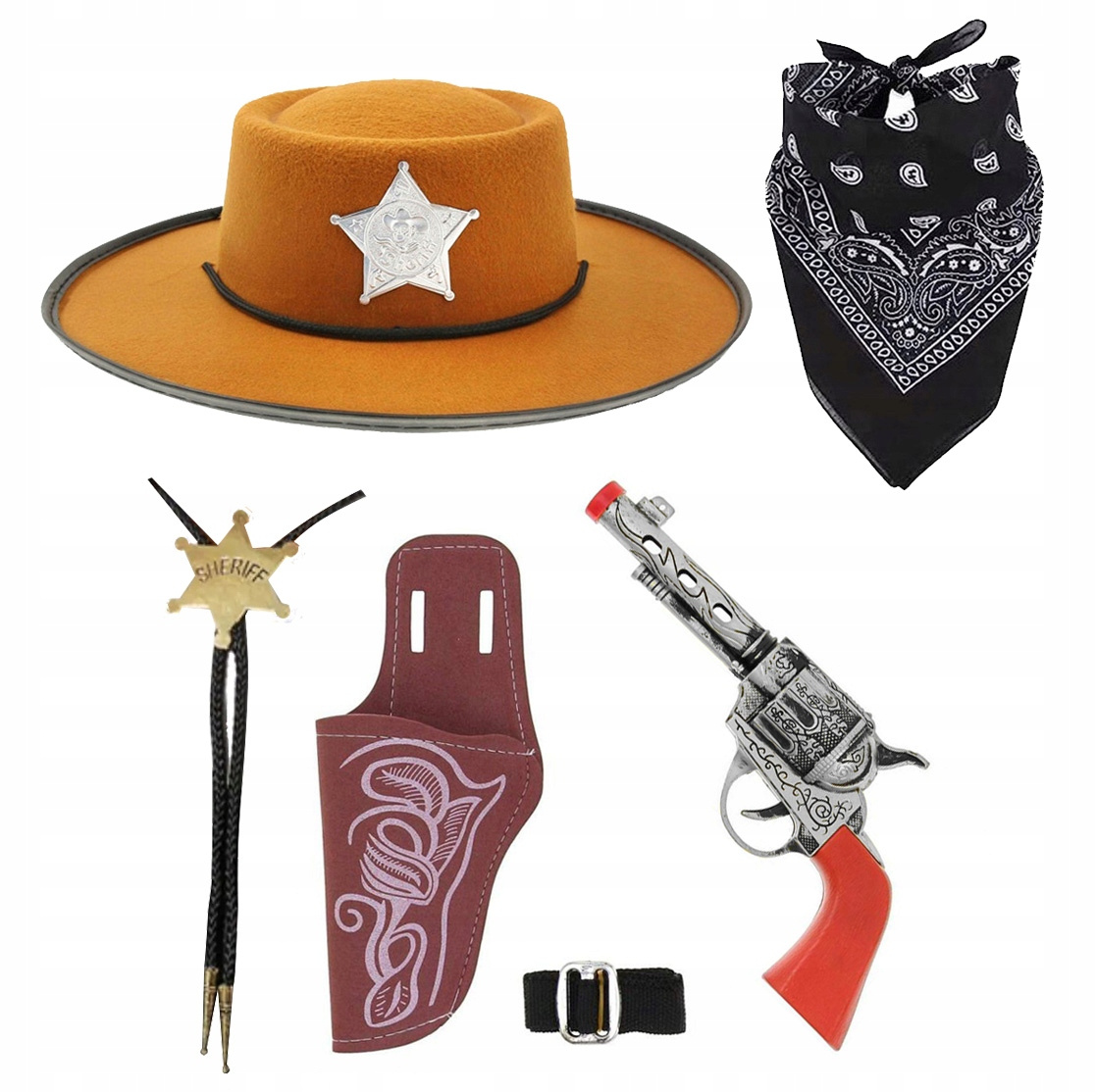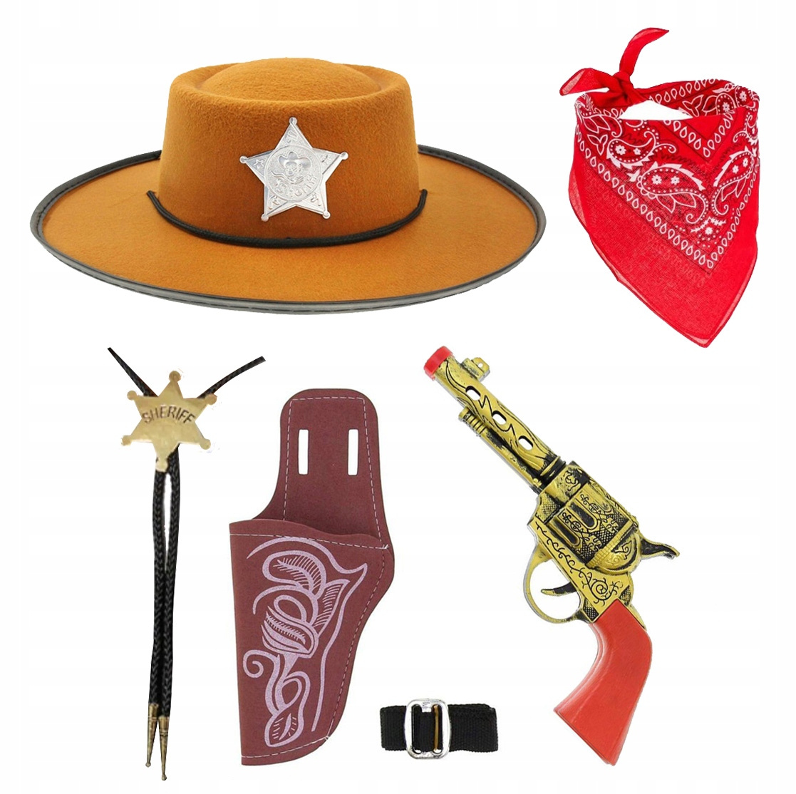 - 1 rewolwer zabawka (kolor srebrny lub złoty - wybieramy przypadkowo) wraz z kaburą i paskiem