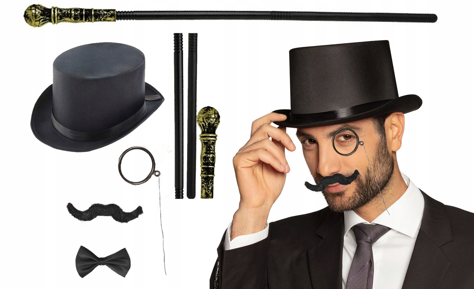 STRÓJ DŻENTELMENA CYLINDER CZARNY MONOKL WĄSY MUSZKA LASKA Z GAŁKĄ SKŁADANA