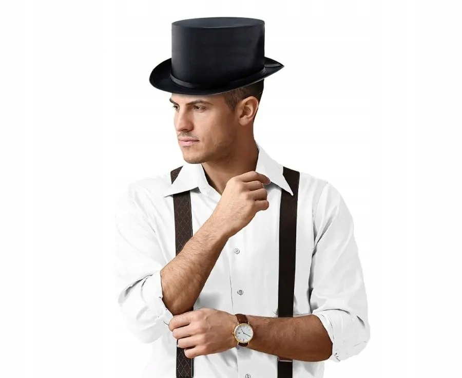 • cylinder gładki czarny - uniwersalny rozmiar dla dorosłych (cylinder posiada wszytą wewnątrz elastyczną gumkę, dzięki której pewnie trzyma się głowy)
