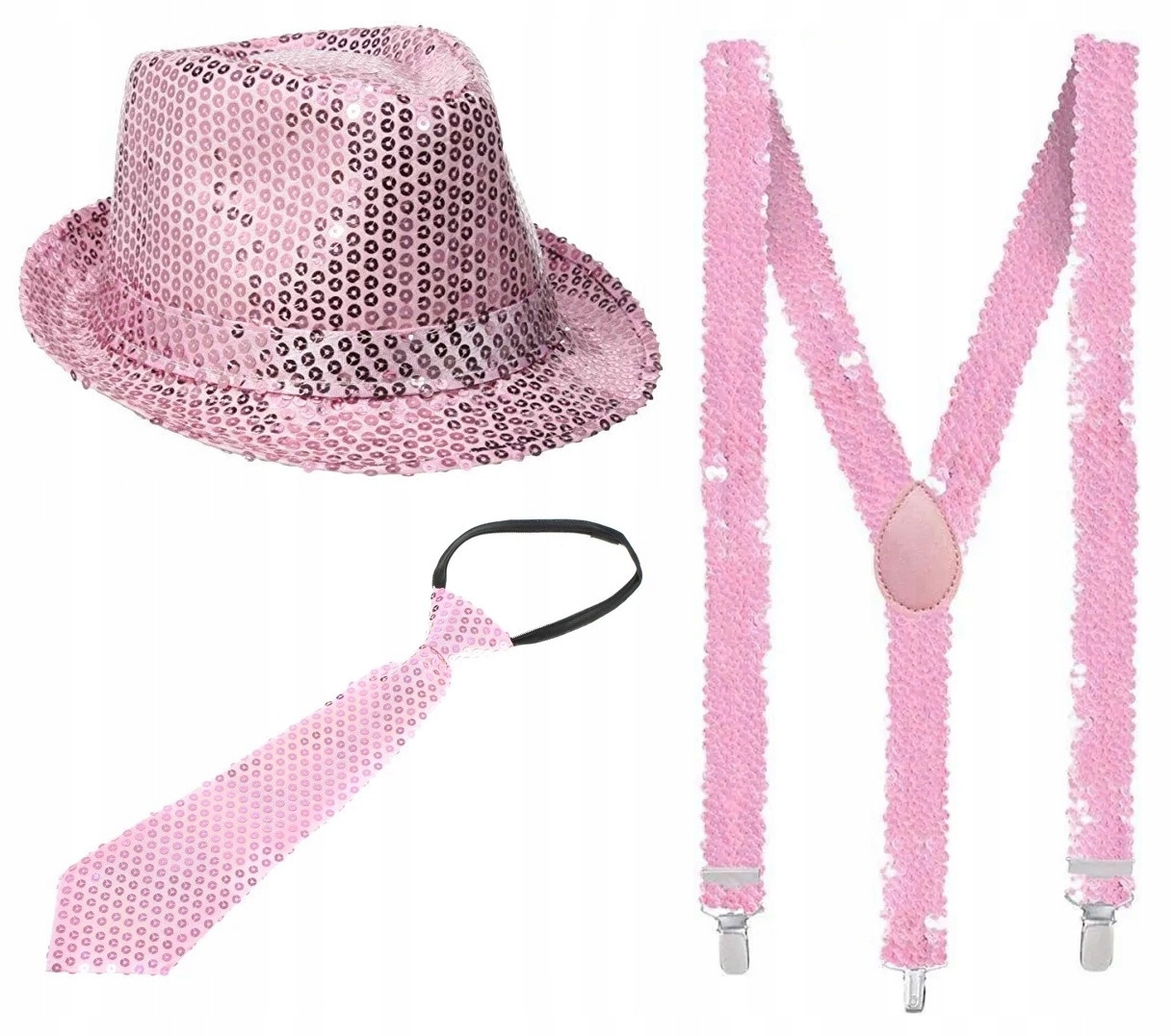 ZESTAW PUDROWY RÓŻ KAPELUSZ CEKINOWY KRAWAT SZELKI CEKIN JASNY RÓŻOWY