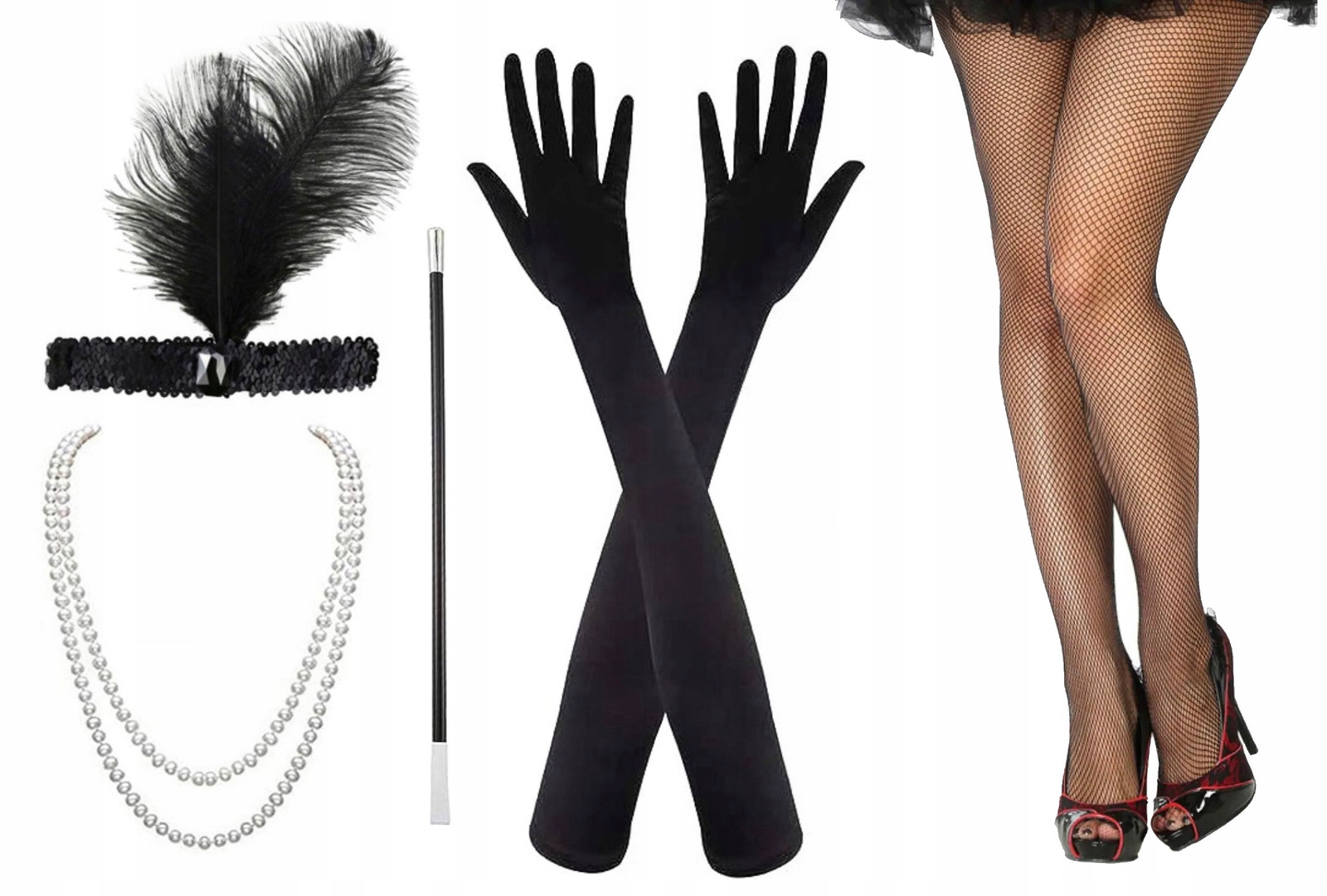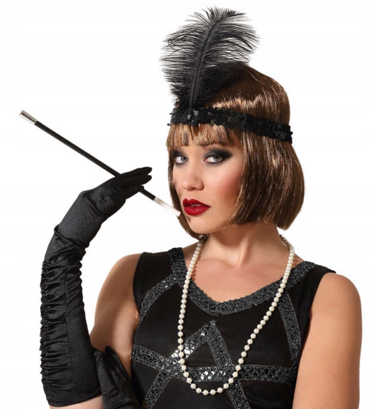 - Opaska na gumce – ozdobiona cekinami i subtelnym piórkiem, idealna do uzupełnienia oryginalnego looku.